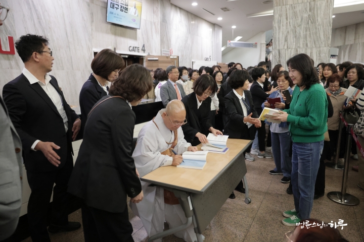 행복한 대화를 마치고 로비에서는 스님의 책 사인회가 펼쳐졌습니다. 스님 책에 사인받기 위해 많은 사람이 로비를 가득 메웠습니다.