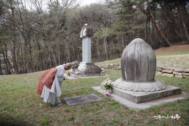 구불구불한 산길을 올라가자, 탑비와 부도탑이 보였습니다. 스님은 부도탑 앞에서 삼배를 하고 스승이신 서암 큰스님을 회상했습니다.