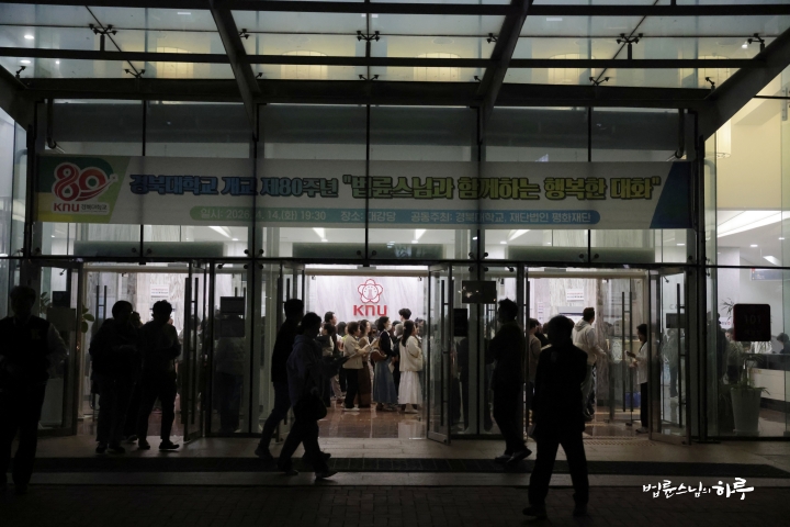 강연장에는 스님의 강연을 듣기 1,800여명의 사람들이 모였고 활기가 있었습니다. 저녁 7시 30분이 되자 스님은 대중들의 열렬한 환호를 받으며 무대 위에 올랐습니다. 스님은 먼저 경북대학교 개교 80년을 축하하며, 이렇게 큰 대강당을 사용할 수 있도록 해준 학교 측에 감사의 박수를 유도했습니다. 스님은 사전 질문자들과 차례로 대화의 시간을 가졌습니다.