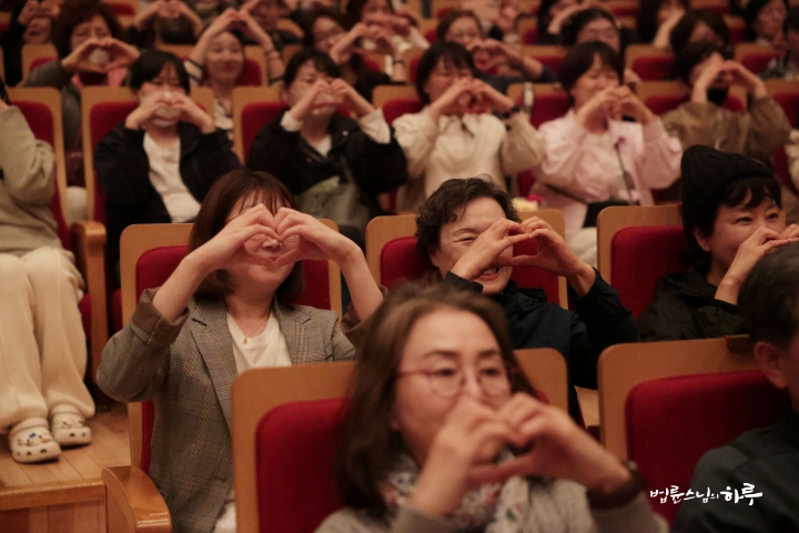 “오늘 모두 즐거우셨나요? 오늘 소중한 시간을 나누어주신 스님께 감사 인사를 드리며 우리 모두 손에 하트를 그리며 저를 한번 따라 해보실까요?”
