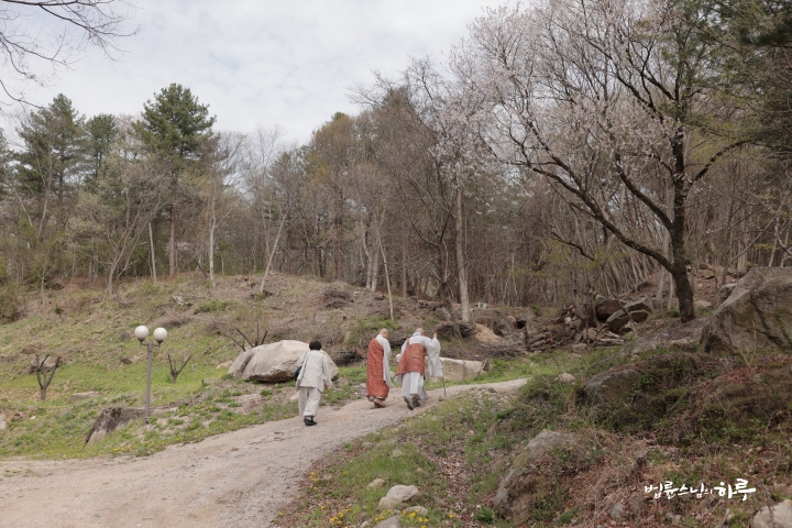 스님은 벚꽃 동굴을 지나 봉암사 도량 안으로 들어가기 전에 차를 세우고, 서암 큰스님 부도탑을 참배하기 위해 산길을 걸어 올랐습니다.